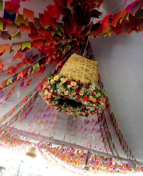 E o teto da sua varanda também pode ficar bem enfeitado com um cesto de flores pendurado juntamente com as tradicionais bandeirinhas de festa junina.