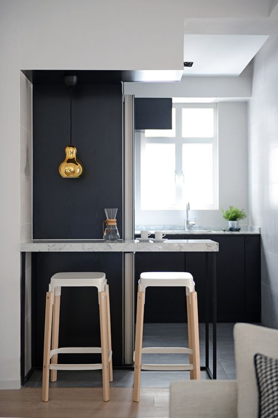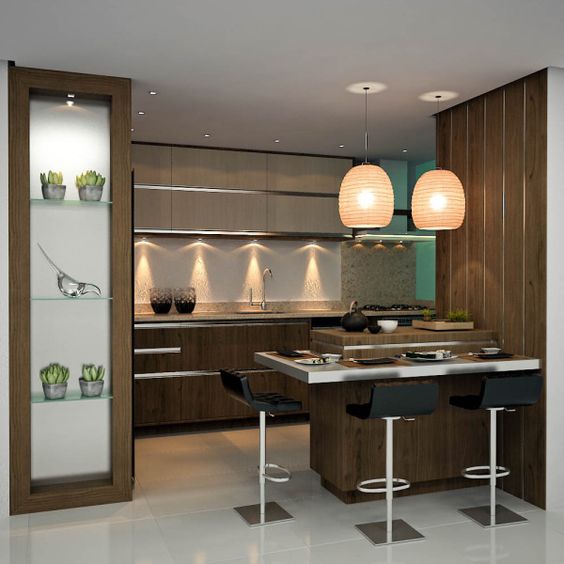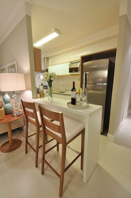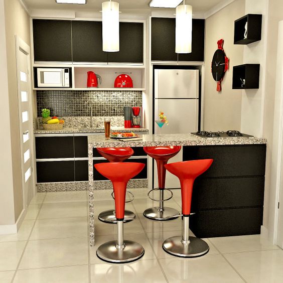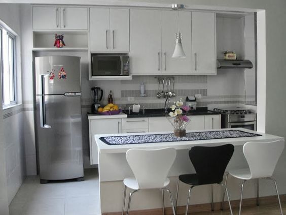 Boa iluminação e cores claras nas paredes também são fundamentais para criar ilusão de ambiente maior. E para a cozinha você também pode utilizar móveis e objetos funcionais, e aproveitar todos os cantinhos de sua cozinha, pendurando em suportes específicos as panelas e utensílios mais charmosos, por exemplo, assim você otimiza todo o espaço e ainda garante uma linda e diferenciada decoração.