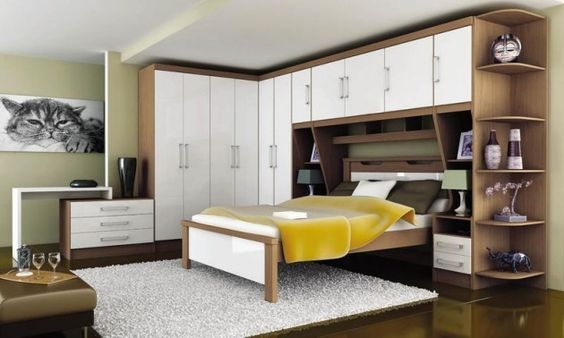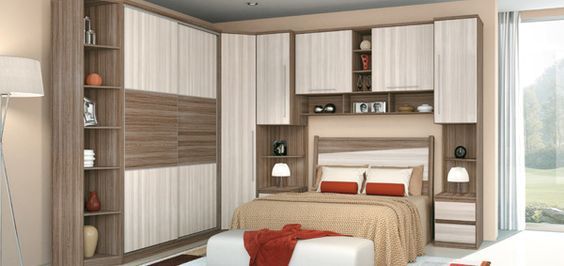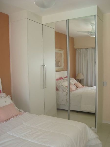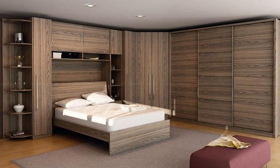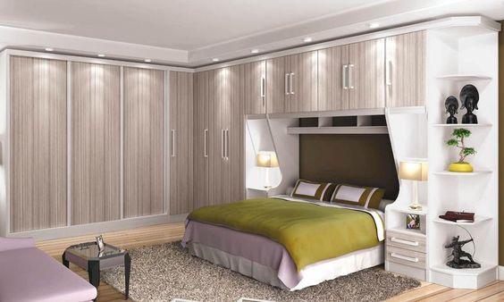 A cama também pode estar embutida em um guarda roupa de canto. E este guarda-roupa pode pegar duas paredes inteiras do seu quarto, caso o ambiente possua disponibilidade suficiente.