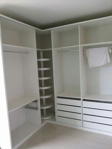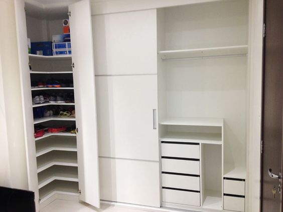 Aproveite a parte do canto para guardar sapatos ou outros itens pequenos. Se você estiver fazendo o seu guarda-roupa coloque parte giratória ou prateleiras de canto, para otimizar ainda mais o espaço.