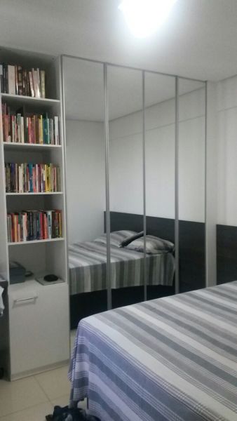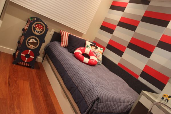 Espelhos são uma constante em espaços muito pequenos, para criar ilusão de ambiente maior, pois o espelho dobra tudo que está no cômodo e assim a ilusão é criada. Em um quarto infantil onde o espaço é muito diminuto, onde cabe apenas uma cama e um armário, vale investir em um armário com portas espelhadas, para duplicar visualmente a cama da sua criança, que normalmente vai estar posicionada de frente para o espelho.