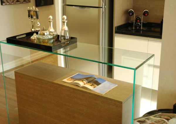 Uma ótima opção para tirar o aparador de vidro do lugar-comum é utilizando-o como divisória de ambientes, sem estar encostada com em uma parede. E se o seu aparador for inteiro confeccionado com vidro, ele irá delimitar o espaço, mas de forma bem discreta e sem chamar muito a atenção.