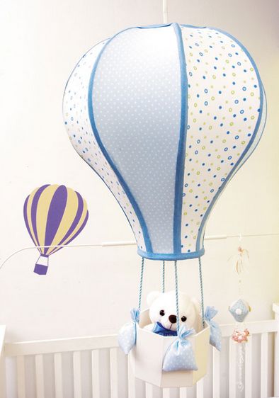 E há ainda a opção de colocar a mão na massa e fazer um balão para pendurar no quarto de sua criança. Criando o balão com uma armação de arame e revestindo a peça com tecido. E na cestinha do balão acrescentado um bichinho de pelúcia.
