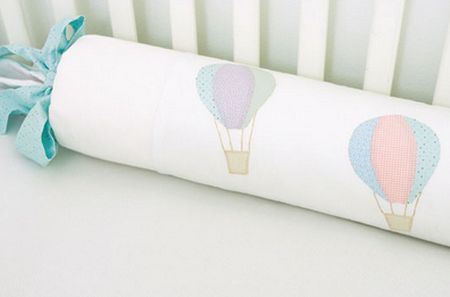 Há também a opção de investir em aplicação de balão na parte protetora do berço, na parte almofadada, que pode ser feita até mesmo por você, em casa, com você costurando uma tira com o comprimento da lateral do berço e acrescentando dentro da peça uma espuma fina.