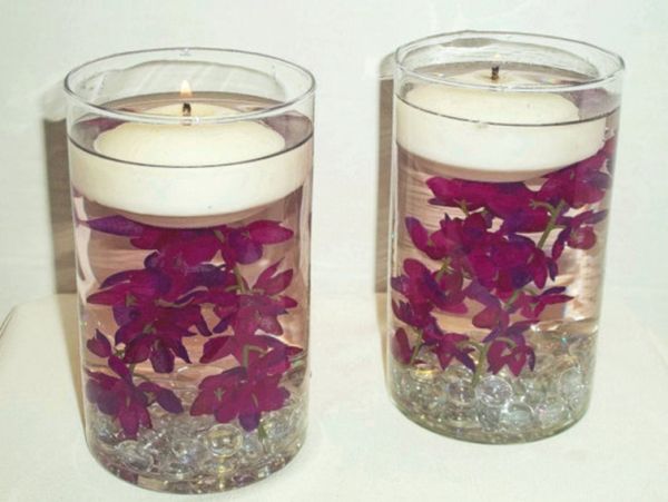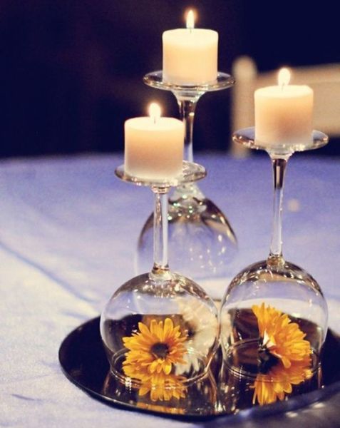 Um centro de mesa muito fácil de ser conseguido, e sem a necessidade de você precisar customizar alguma peça ou criar uma peça, é posicionar uma taça com a borda para baixo, mas sobre um pratinho, e dentro da taça posicionar uma flor ou outro elemento decorativo, e em cima acomodar uma vela pequena, com o tamanho da base da taça.