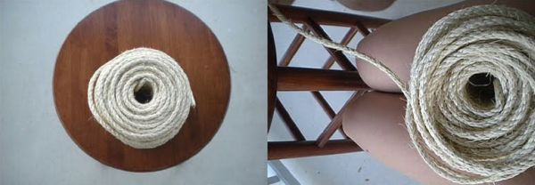 Em seguida, separe a corda que você irá utilizar para customizar o seu banquinho e enrole-a sobre o seu colo, para facilitar no momento em que você estiver revestindo o seu banquinho com a corda.