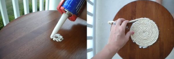 Logo após, aplique a cola de sua preferência, podendo ser uma cola tudo, pistola de cola quente ou a cola resistente que você quiser utilizar para fazer a sua personalização de banco de madeira, bem no centro do assento do banco escolhido e já muito bem limpo. Então posicione a ponta da corda no centro do assento do banco, sobre a cola, e comece a enrolar a corda em seu próprio eixo, sobre o assento do banco, formando um espiral. E siga enrolando a corda até chegar à borda do assento do banco.