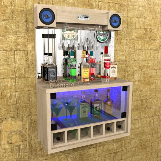 Separe um espaço em seu móvel, espalhe as garrafas de bebida de acordo com a “família” das bebidas, coloque copos e taças juntos, mas de forma ordenada, e acrescente alguns objetos de decoração em seu bar, ou até mesmo incorpore iluminação à peça.