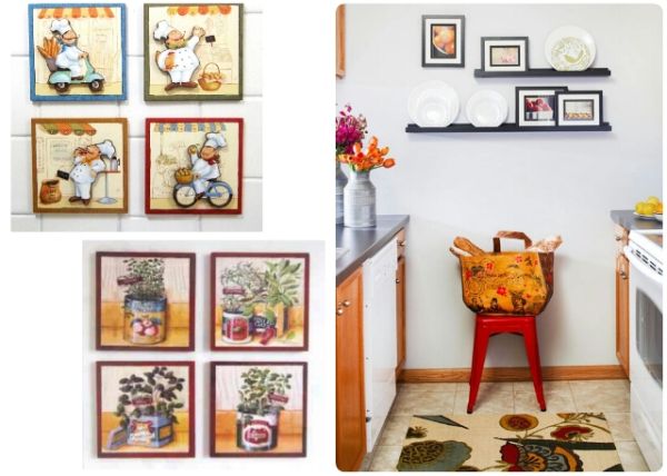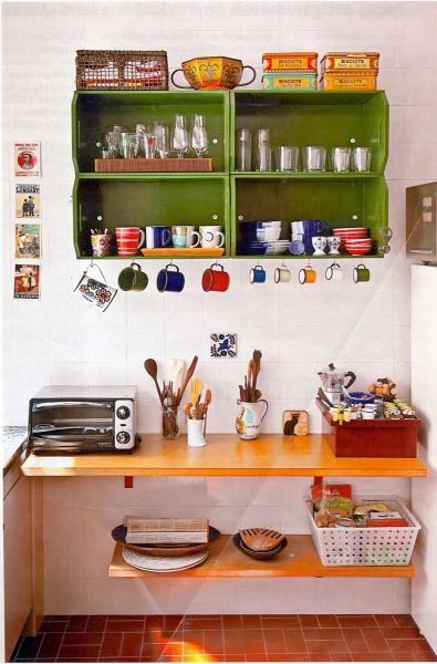 Mas você também pode apostar em espalhar as louças de sua casa por prateleiras ou armários, decorando assim a cozinha sem gastar nada; pode também utilizar quadrinhos vendidos em lojas de R$1,99; pode utilizar tapetes e cortinas de outros cômodos; e pode colocar vasinhos com plantas na cozinha, entre muitas outras opções.