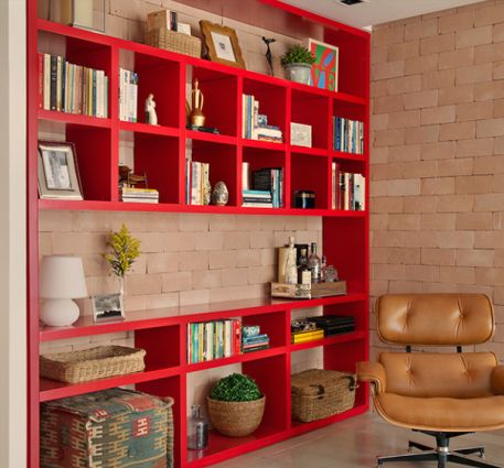Para quem gosta de cor vale investir em estantes com cores vibrantes e intensas, para que toda a atenção vá para a estante. O restante da decoração do espaço pode tanto possuir outros objetos com cores fortes quanto ser totalmente neutra e só a estante colorida.