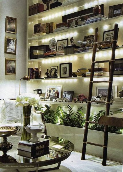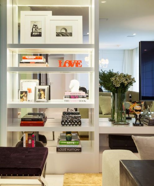 Capriche na iluminação da sala de estar, para evidenciar a sua estante e os objetos dentro dela. Se você quiser pode diferenciar ainda mais o visual de seu cômodo acrescentando iluminação indireta nas divisórias da estante, para ressaltar o objeto que estiver posicionado neste espaço.