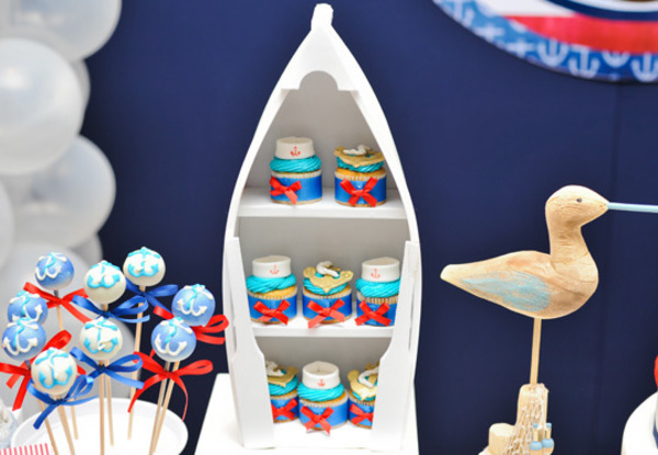 Veja que legal esse barco de madeira, acomodado em pé onde foram colocados cupcakes personalizados e demais doces.