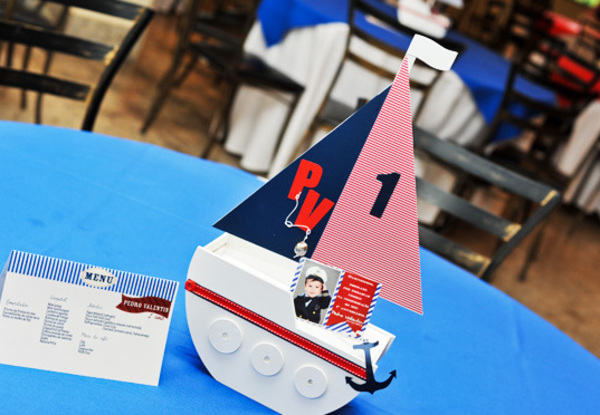Veja que bacana esses centros de mesa de barquinhos, com a foto do aniversariante.