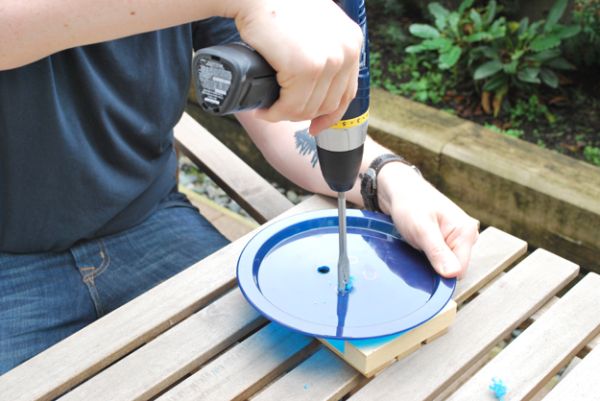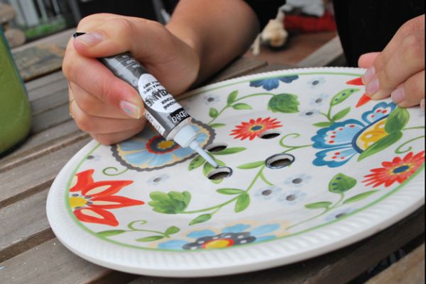 Comece medindo o centro do prato escolhido, com o auxílio da régua e do lápis, desenhando onde os furos irão ficar ao final do trabalho e furando o seu prato com o auxílio da furadeira com broca específica para furar plástico, e fazendo dois ou quarto furos, dependendo de sua preferência.