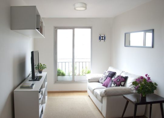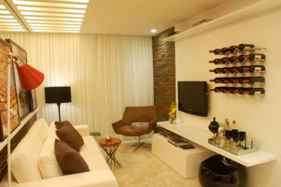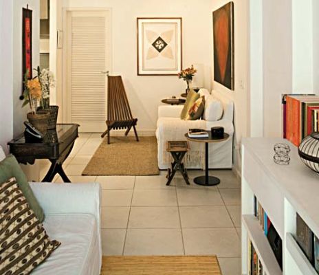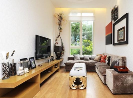 Como o espaço é diminuto, evite abarrotar a sala com móveis ou objetos de decoração. Uma sala muito estreita, por exemplo, não comporta mesa de centro, pois o ambiente perderia espaço para mobilidade, em vez disso, aposte em aparadores pequenos ou mesinhas baixas ao lado do sofá.