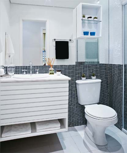 Para alongar este banheiro, a parede foi revestida com pastilhas pretas à meia altura e brancas na metade de cima. O nicho em cima do vaso e o armário aberto deixam o ambiente mais prático. Não se esqueça que a iluminação, natural e artificial, é importante e deve atender as necessidades do lugar.