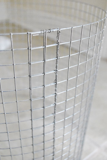 Em seguida, uma as extremidade da tela de arame para formar um cilindro. E para fazer a união das partes, corte pedaços de arame fino, com o auxílio do alicate com corte, e passe pelas grades da tela, deixando bem firme.