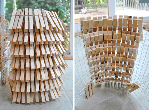 Em seguida, comece a posicionar os prendedores para roupas nas grades da tela de arame.