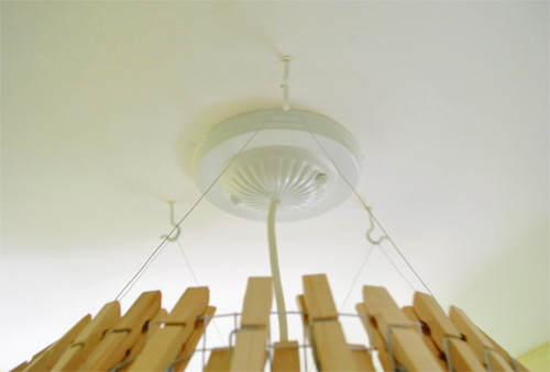 Logo após, para finalizar a sua peça, assim que toda a tela estiver revestida com os prendedores para roupas, basta fixar pedaços de arame na parte de cima, fixar o suporte com o soquete e a lâmpada e pendurar. E está pronto!