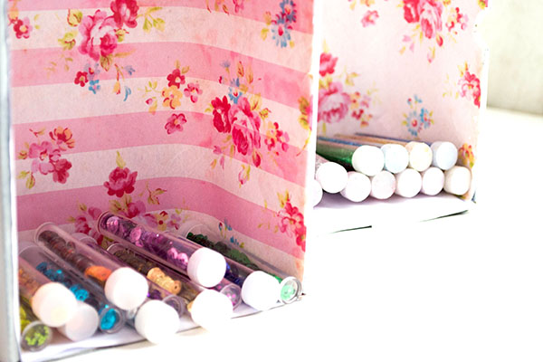 Logo após, escolha outro papel de sua preferência e encape a parte interna das caixas que você vai utilizar. Depois deixe a cola secar muito bem antes de manusear novamente a sua peça e continuar com a confecção de seu lindo artesanato.