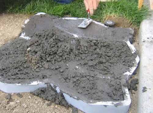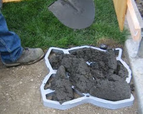 Comece misturando o cimento com a água em uma superfície plana ou dentro de um carrinho de mão. E siga as instruções do fabricante para não errar na mistura. Depois, se você quiser, adicione cor ao seu cimento, podendo ser mais escuro ou mais claro, pois existe um pigmento próprio para colorir cimento, concreto e argamassa chamado Pó Xadrez. Quando o cimento estiver misturado e colorido da forma que você deseja, use a armação de madeira ou de ferro, com o formato desejado, para criar os blocos de concreto de seu caminho em seu jardim, colocando o cimento misturado dentro de cada reentrância, com o auxílio de uma pá.
