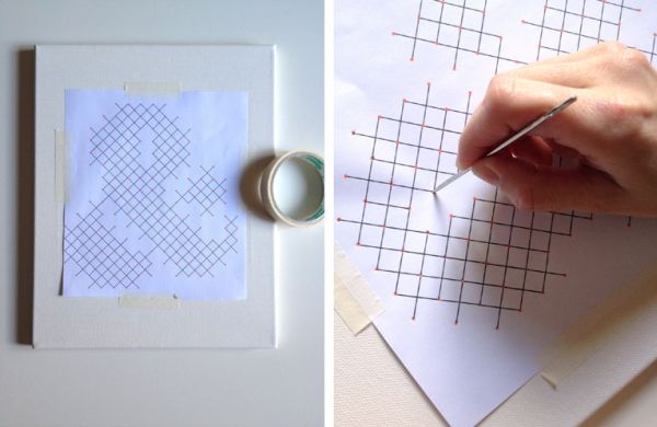 Comece posicionando o motivo de ponto cruz sobre a tela de lona escolhida e fixando o papel com o auxílio de pedaços de fita adesiva. Depois, com o auxílio da agulha para tapeceiro, fure todos os pontos de junção dos motivos do molde.