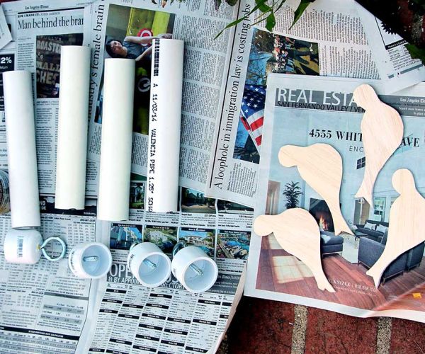 Logo após, recorte os detalhes de madeira e corte os canos de PVC com o tamanho que você desejar. E ao final, pinte todas as partes com a tinta em spray com a cor de tina ta escolhida. E aplique verniz nas peças de madeira, se você desejar.