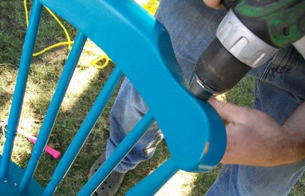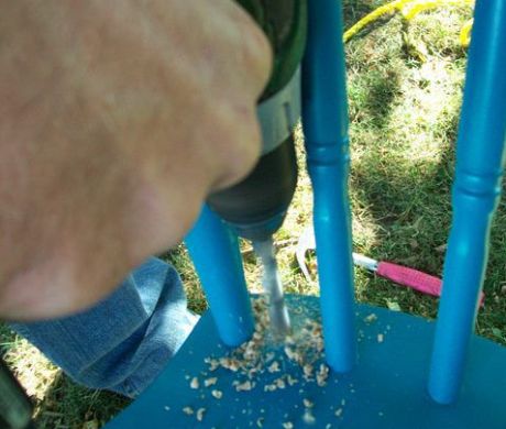 Logo após, com o auxílio da furadeira, fure os quatro cantos do assento da cadeira e também o encosto. E serre as pernas de sua cadeira, com o auxílio do serrote ou da serra, deixando apenas o assento e o encosto.