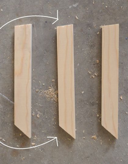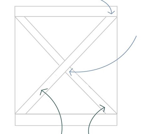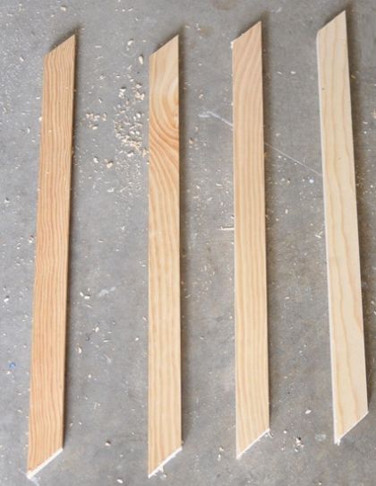 Logo após, faça os detalhes das laterais do seu cachepot. E para isso serre tiras finas de madeira, mas seguindo o esquema da imagem a seguir e o tamanho das laterais do cachepot, mas o tamanho em diagonal. E lembrando que uma tira será pregada interia e a outra parte deve ser serrada, mas com o corte do meio não muito inclinado em diagonal. E uma boa dica é fazer um teste antes com um papel até conseguir encontrar a inclinação correta do corte.
