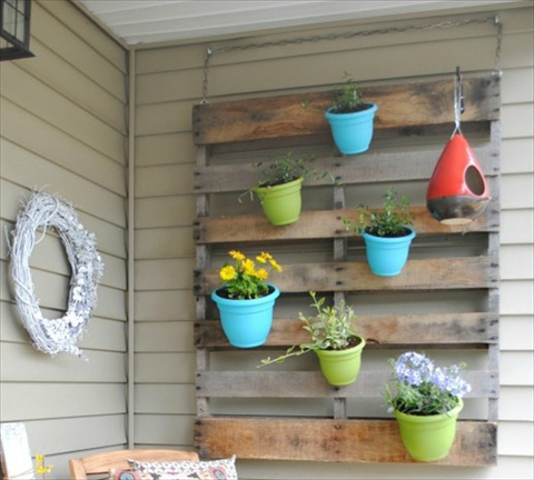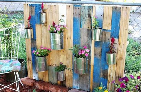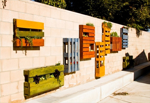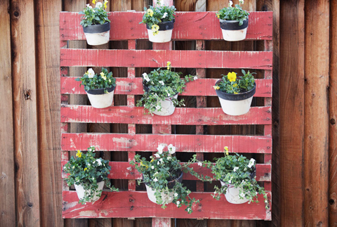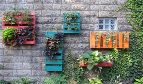 Um jardim barato de ser conseguido é o jardim vertical feito com pallets. Se você quiser incrementar o seu jardim, você pode aplicar uma tinta colorida, com a cor que você quer, ou pode ainda aplicar tinta-lousa nas ripas, para escrever o nome da planta ou até mesmo do tempero, caso você queria fazer uma horta vertical.