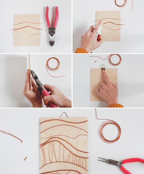 Logo após, corte pedaços do fio de cobre, com o auxílio do alicate para corte, mas com os pedaços com tamanho suficiente para que as pontas possam ser levadas para a parte detrás do seu pedaço de madeira, posteriormente. Posicione os primeiros pedaços de fio, que serão a base dos “movimentos” que você queira criar em sua peça, depois aplique a cola E6000 em spray sobre os detalhes, para fixar. Deixe secar. Então, leve as pontas do fio para a parte traseira do seu quadrinho. E continue posicionando pedaços de fio de cobre sobre o seu pedaço de madeira.