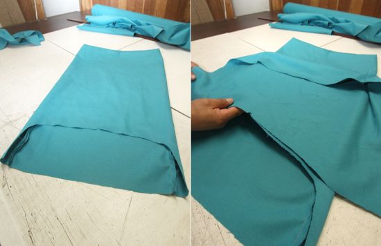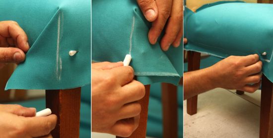 Agora, prenda os cantos do tecido com um alfinete de cada lado, deixando formar dobras com as folgas do tecido, e rente ao assento, marque com o giz as partes que deverão ser recortadas posteriormente.
