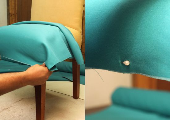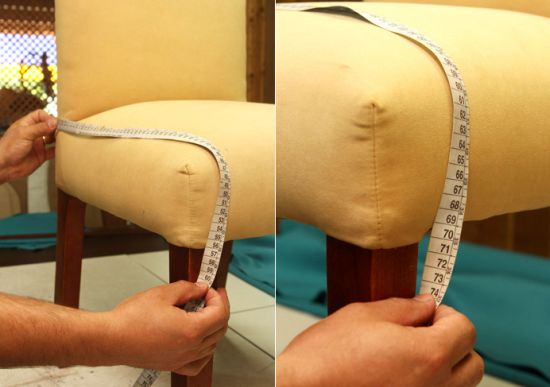 Em seguida, passe para o tecido escolhido as medidas tiradas anteriormente. Corte o retângulo formato e fixe-o na cadeira com o auxílio dos alfinetes para costura.