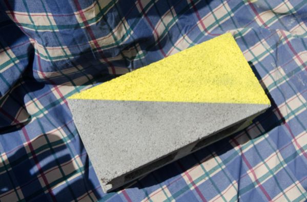 Comece posicionando os blocos de concreto na parte de sua casa que você quer e, marque, com o auxílio e um lápis, quais partes você irá pintar, podendo formar os motivos e desenhos que você quiser. Depois, posicione em um bloco um pedaço de papel, de jornal ou plástico, e prenda com fita adesiva, para delimitar onde você irá pintar o seu bloco.