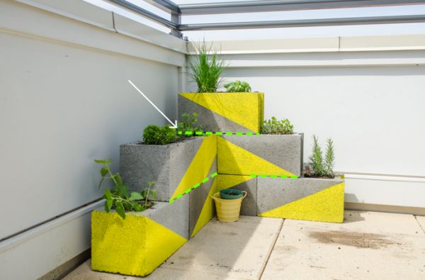 Logo após, para finalizar a sua peça, assim que todos os blocos de concreto estiverem pintados e com a tinta já bem seca, comece a posicionar a lona e a tela de arame na parte de baixo do bloco e posicionando um bloco sobre o outro e sempre utilizando a lona e a tela de arame nas partes que você for plantar as sementes. Depois jogue pedras no fundo, para a drenagem da água, e termine de encher os espaços com terra. Então basta plantar o que você quiser. E está pronto!
