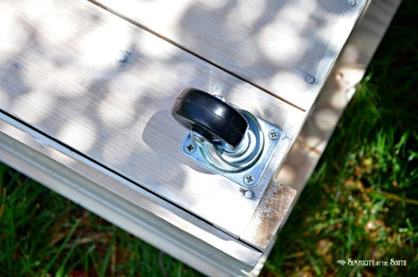 Em seguida, após a tinta estar seca, fixe as rodinhas na parte debaixo da caixa, com o auxílio de uma ferramenta específica.