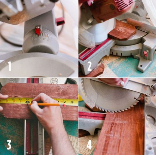 Comece serrando alguns pedaços de madeira que serão a estrutura de sua prateleira. E nos cantos faça cortes em diagonal. E se você não possuir uma serra elétrica, você pode serrar os pedaços de madeira com um serrote.