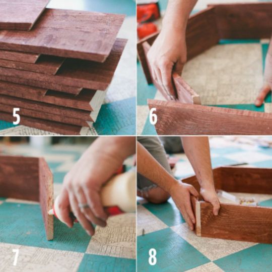 Em seguida, corte alguns pedaços de madeira com ponta em diagonal, para que você consiga “encaixar” um pedaço de madeira ao outro, para criar a estrutura de sua prateleira. Você pode fazer quantas repartições você quiser, mas deve averiguar antes de quantas peças de cada modelo você irá precisar.