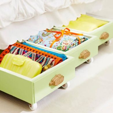 E você também pode utilizar as gavetas para guardar as suas roupas de cama, mesa e banho, e para isso basta você acoplar rodinhas em suas gavetas e deixá-las embaixo de sua cama, para organizar de forma charmosa as suas peças.
