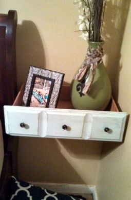 Para quem quer utilizar uma gaveta, porém não quer nem pintá-la, basta posicioná-la contra a parede, com a cama pressionando-a, para que a gaveta sirva como um criado-mudo muito diferenciado e interessante em seu quarto. E se a gaveta estiver bem encaixada entre a cama e a parede, você pode até mesmo colocar um vasinho de vidro dentro da gaveta, que ela aguenta firme e não cai.