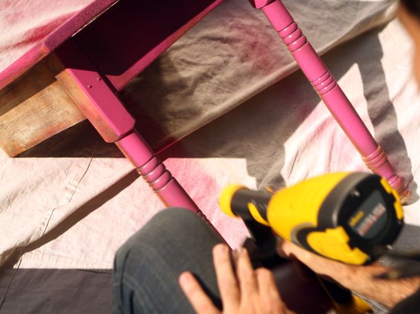 Logo após, pinte as duas partes da mesa, com o auxílio de um pincel ou de um pulverizador de tinta, de acordo com a sua preferência. Deixe secar muito bem, e se for necessário, aplique uma segunda ou até mesmo uma terceira camada de tinta, mas sempre deixando o tempo necessário de secagem entre uma camada de tinta e outra.
