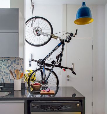 Se você acha que somente a sala ou outra área de convívio social pode receber uma bicicleta como item decorativo, está totalmente enganada, pois todos os cômodos de sua casa podem receber uma bike como item de decoração ou um cantinho para você guardá-la. E você pode incorporar a sua bicicleta até mesmo em sua cozinha, e para economizar espaço tão precioso neste cômodo, pendure sua bike.