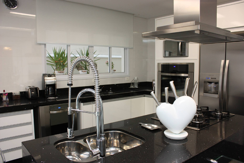 A cozinha americana, queridinha atualmente, também pode entrar na dança e ganhar as cores preta e branca. A cozinha pequena simples, sendo americana ou não, também pode receber esta dupla de cores. Porém, se você está buscando ampliar visualmente a sua cozinha, deixe a cor branca dominar a maior parte do cômodo e “jogue” apenas uns toques da cor preta.