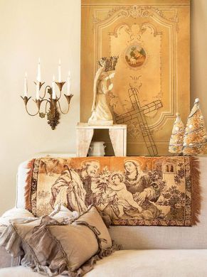 E invista também em galhos secos (que são baratos, mas que produzem um efeito visual bem acolhedor para a decoração); em fitas com as cores escolhidas e incorporadas em almofadas, toalhas no banheiro, e na mesa de Natal; e em peças sacras, caso você seja religiosa.