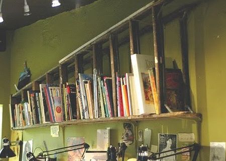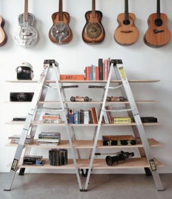 A escada de madeira também pode ser usada em outra posição, além da vertical. Você pode fixar a escada em horizontal na parede de seu cômodo e acomodar livros, objetos de decoração ou até mesmo ser suporte para quadros ou porta-retratos.