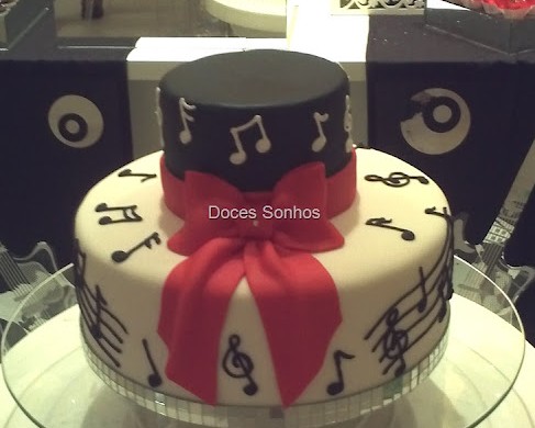 Para um bolo bem diferente, os que tem andares aparecem mais e possuem uma infinidade desenhos para a sua composição. Este bolo tem notas pretas na parte branca e notas brancas na parte preta e menor. O laço vermelho é lindo, deixa o bolo mais delicado e dá um toque todo charmoso à mesa.