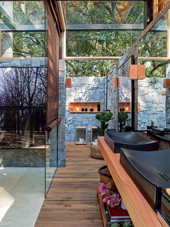 As pedras também podem estar presentes em seu jardim de inverno, fixadas na parede, caso o seu jardim de inverno fique na parte externa. E você pode revestir todas as paredes de seu jardim de inverno com pedras ou apenas uma, de acordo com a sua preferência.