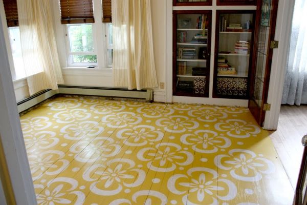 Até a parte externa da sua casa pode receber um piso colorido. Se você possuir um deck de madeira em seu quintal você pode pintar uma parte e fazer ainda um detalhe com estêncil, para diferenciar ainda mais o seu piso.