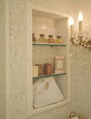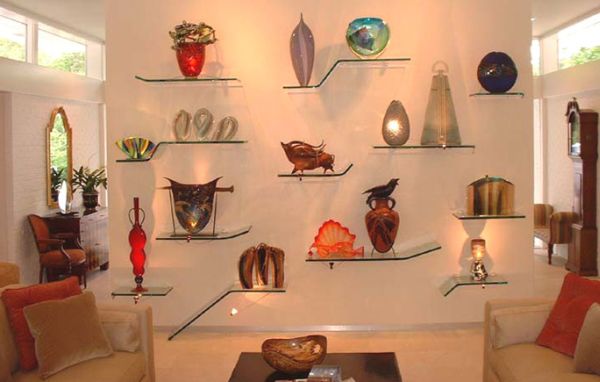 E você pode utilizar as prateleiras de vidro tanto da forma tradicional, com as peças fixadas na parede “soltas” ou criando formas geométricas, quanto encaixadas em detalhes vazados na parede ou em partes mais fundas da parede.