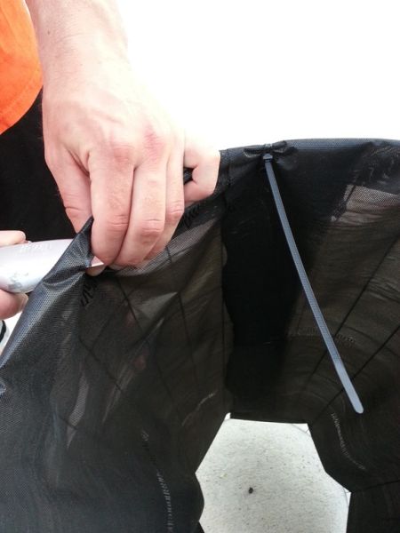 Agora, fure a parte de cima e prenda com abraçadeiras. Corte os excessos das abraçadeiras com o auxílio da tesoura comum.